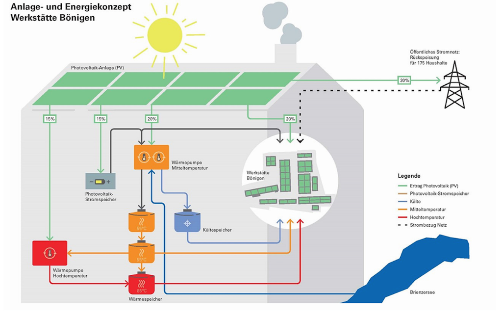 Ergänzt wird das System in Bönigen durch eine grossflächige Photovoltaik- Anlage mit 2500 kWp Leistung sowie einen Batteriespeicher mit 800 kWh Kapazität. Diese Anlage liefert Strom für die gesamte Werkstätte sowie für den Betrieb der Wärmepumpen, Seewasserfassungen und Pumpbauwerk. Der Batteriespeicher ermöglicht es, überschüssigen Solarstrom zwischenzuspeichern und beispielsweise in der Nacht einen Grossteil des Grundverbrauchs zu decken. Ergänzend dazu sorgen thermische Speicher mit insgesamt 96 000 Litern Fassungsvermögen für einen flexiblen Ausgleich von Wärme- und Kältebedarf. Diese Speicher tragen dazu bei, dass Schwankungen im Energieangebot abgefangen werden können. Durch die Produktion von Solarstrom werden durch die BLS weitere 140 Tonnen CO2 jährlich vermieden, im Vergleich zum herkömmlichen Schweizer Strommix.