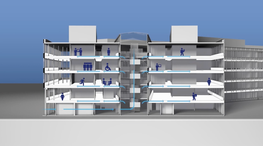 This principle is called “lungs”: fresh air flows into the building from the basement, which is drawn in from a green area behind the building. This air rises through the building's natural thermals and is distributed across the deliberately open-plan floors. Within the storeys, so-called “compound ventilators” ensure uniformly good air quality, even in the meeting rooms and focus rooms.